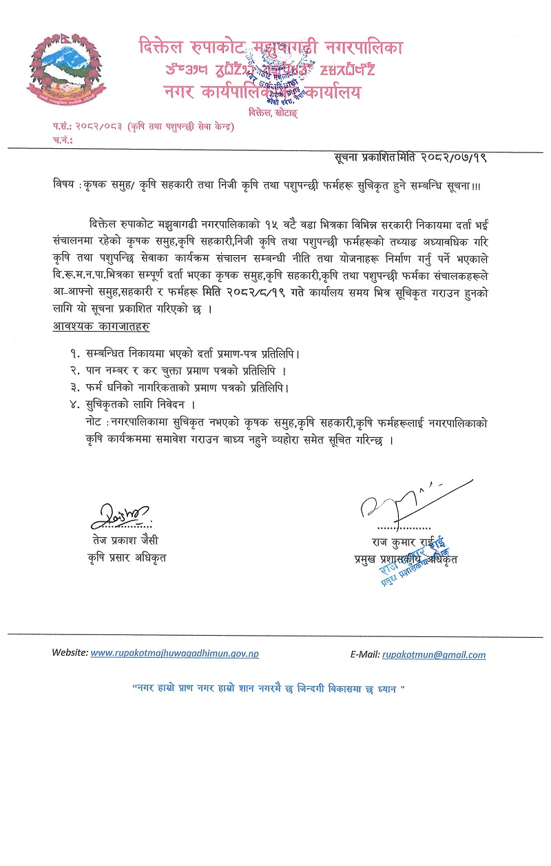 » कृषक समुह/कृषि सहकारी तथा निजी कृषि तथा पशुपन्छी फर्महरु सूचिकृत हुने सम्बन्धि सूचना ।(सूचना प्रकाशित मिति २०८२।०७।१९ गते)