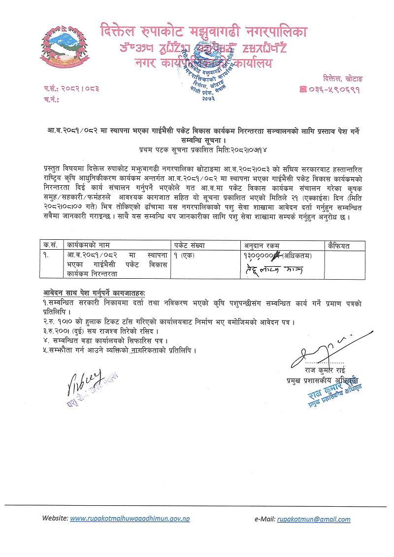 आ.ब.०८१/०८२ मा स्थापना भएका गाईभैसी पकेट विकास कार्यक्रम निरन्तरता सञ्चालनको लागि प्रस्ताव पेश गर्ने सम्बन्धि सूचना । (प्रकाशित मिति २०८२।०७।१६ गते)