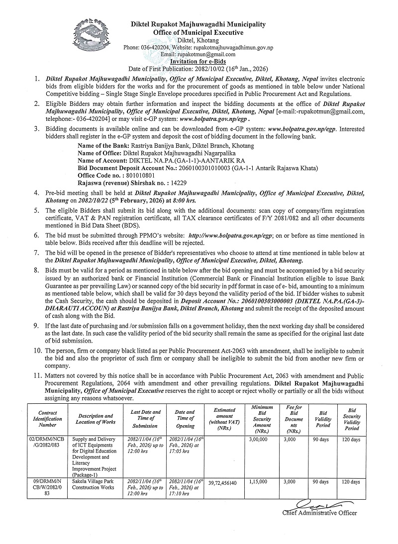 बोलपत्र आह्वान सम्बन्धी सूचना । (प्रथम पटक प्रकाशित मितिः २०८२।१०।०२)