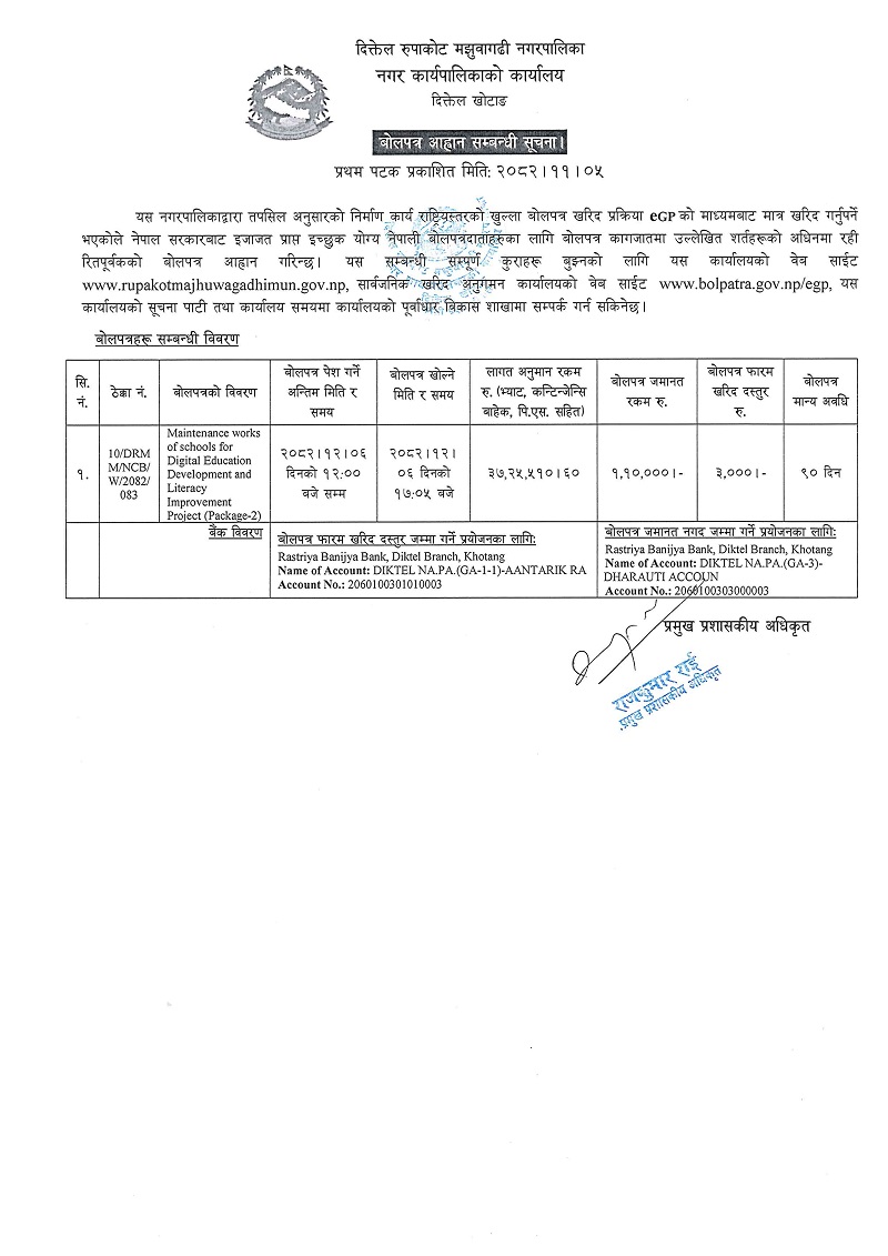 बोलपत्र आह्वान सम्बन्धी सूचना । (प्रथम पटक प्रकाशित मितिः २०८२।१०।०२)