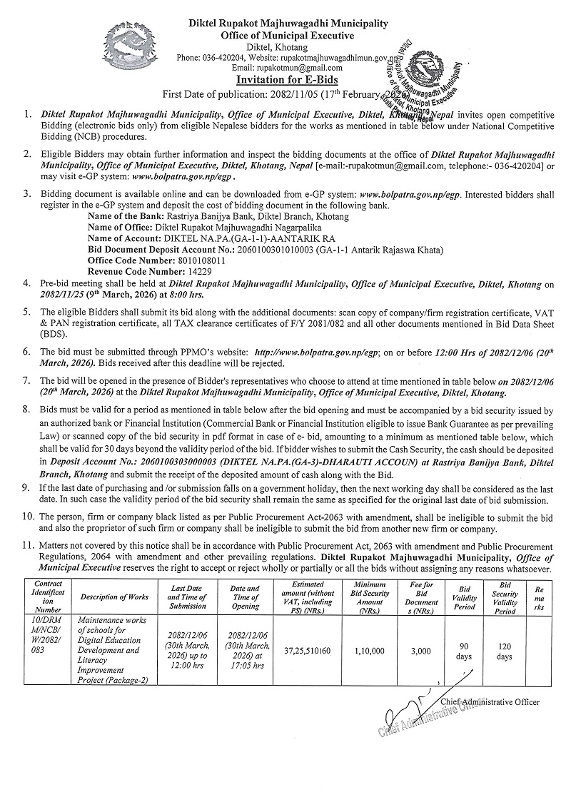 » बोलपत्र आह्वान सम्बन्धी सूचना। (प्रथम पटक प्रकाशित मितिः २०८२।११।०५)