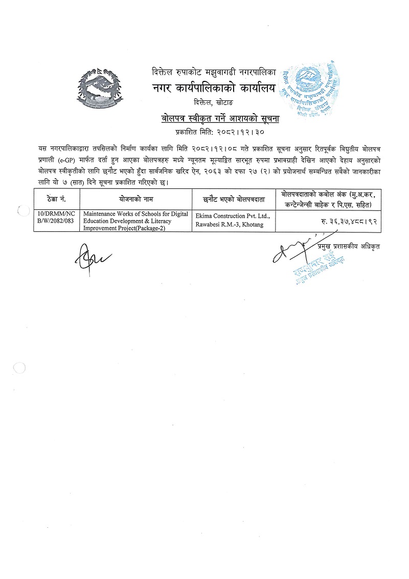 बोलपत्र स्वीकृत गर्ने आशयको सूचना । (प्रकाशित मितिः २०८२।१२।३०)