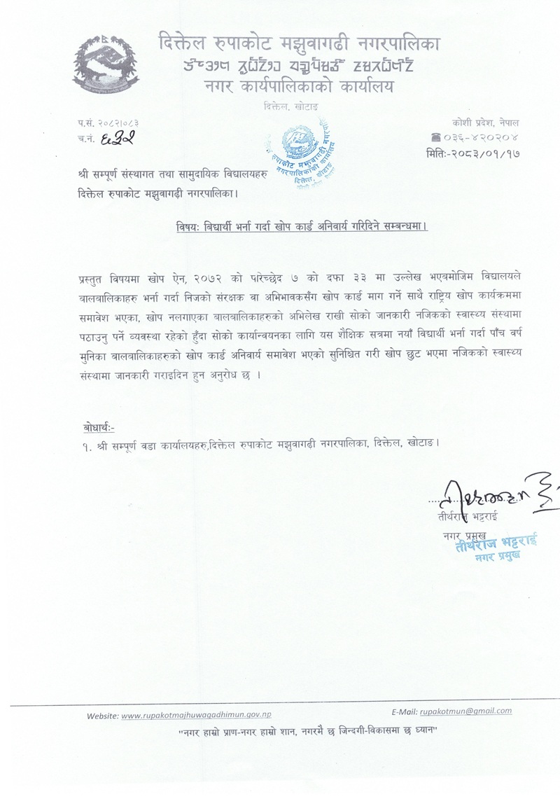 » नगरपालिकाभित्र संचालित सामुदायिक तथा संस्थागत विद्यालयहरु (सबै) - विद्यार्थी भर्ना गर्दा खोप कार्ड अनिवार्य गरिदिने सम्बन्धमा।