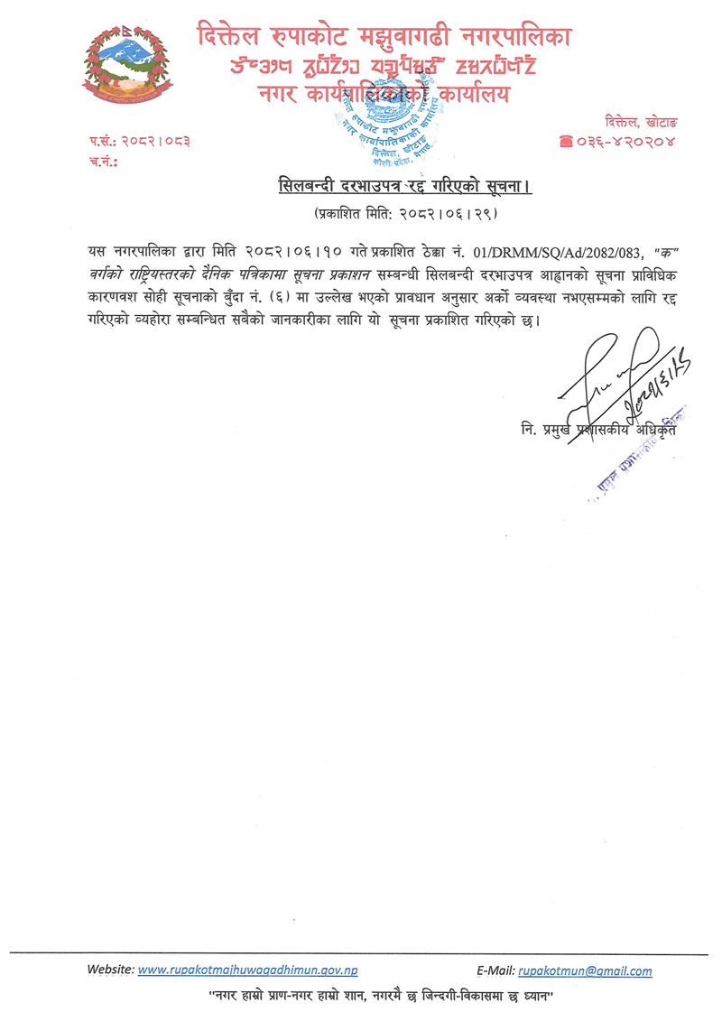 सिलबन्दी दरभाउपत्र रद्द गरिएको सूचना। (प्रकाशित मिति: २०८२।०६।२९)