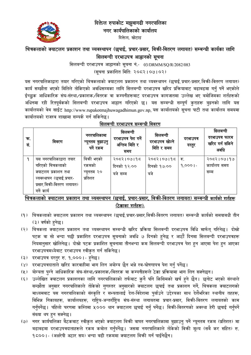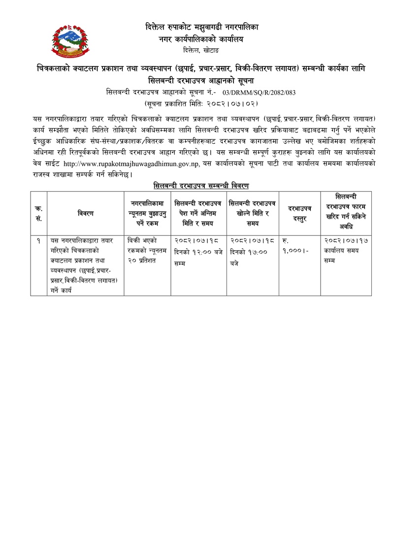 चित्रकलाको क्याटलग प्रकाशन तथा व्यवस्थापन (छपाई, प्रचार-प्रसार, विक्री-वितरण लगायत) सम्बन्धी कार्यका लागि सिलबन्दी दरभाउपत्र आह्वानको सूचना