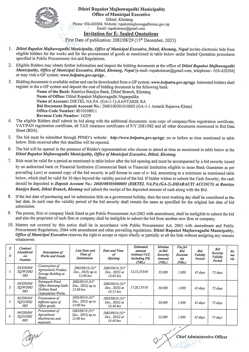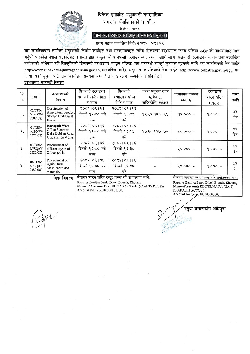 सिलबन्दी दरभाउपत्र आह्वान सम्बन्धी सूचना । (प्रकाशित मिति २०८२।८।२९ गते )