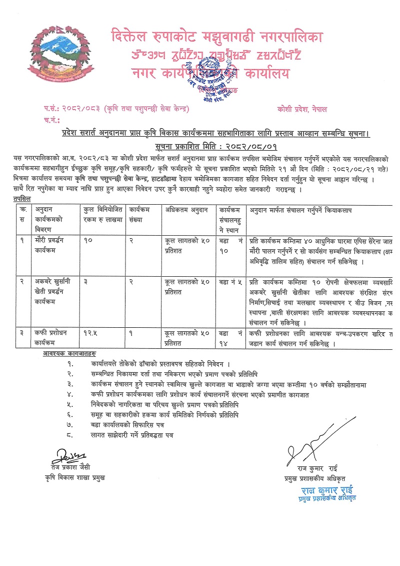 प्रदेश सशर्त अनुदानमा प्राप्त कृषि विकास कार्यक्रममा सहभागिताका लागि प्रस्ताव आव्हान सम्बन्धी सूचना ।(सूचना प्रकाशित मिति २०८२।०८।०१ गते)