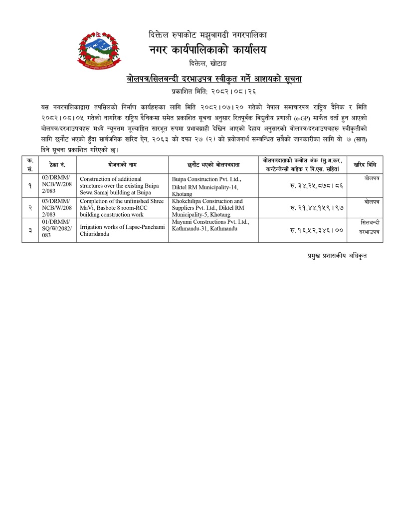 बोलपत्र/सिलबन्दी दरभाउपत्र स्वीकृत गर्ने आशयको सूचना। (प्रकाशित मिति: २०८२।०८।२६)