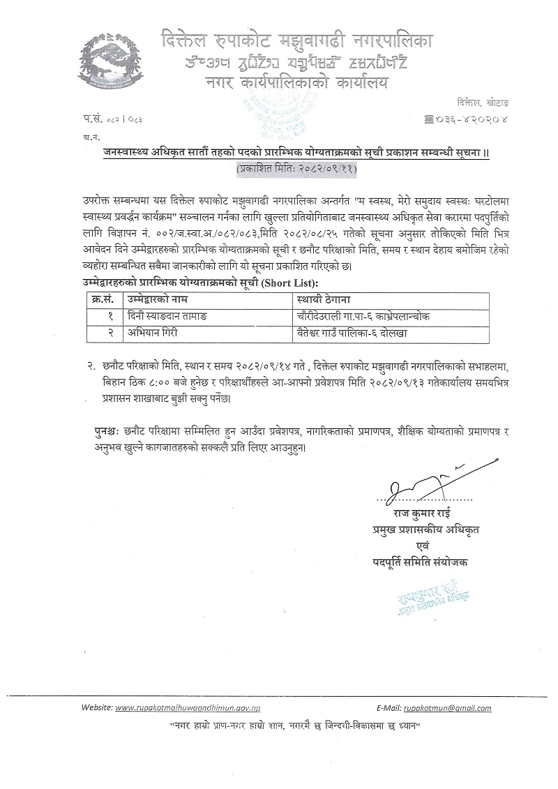 जनस्वास्थ्य अधिकृत सातौं तहको पदको प्रारम्भिक योग्यताक्रमको सूची प्रकाशन सम्बन्धी सूचना । (प्रकाशित मितिः २०८२/०९/११)