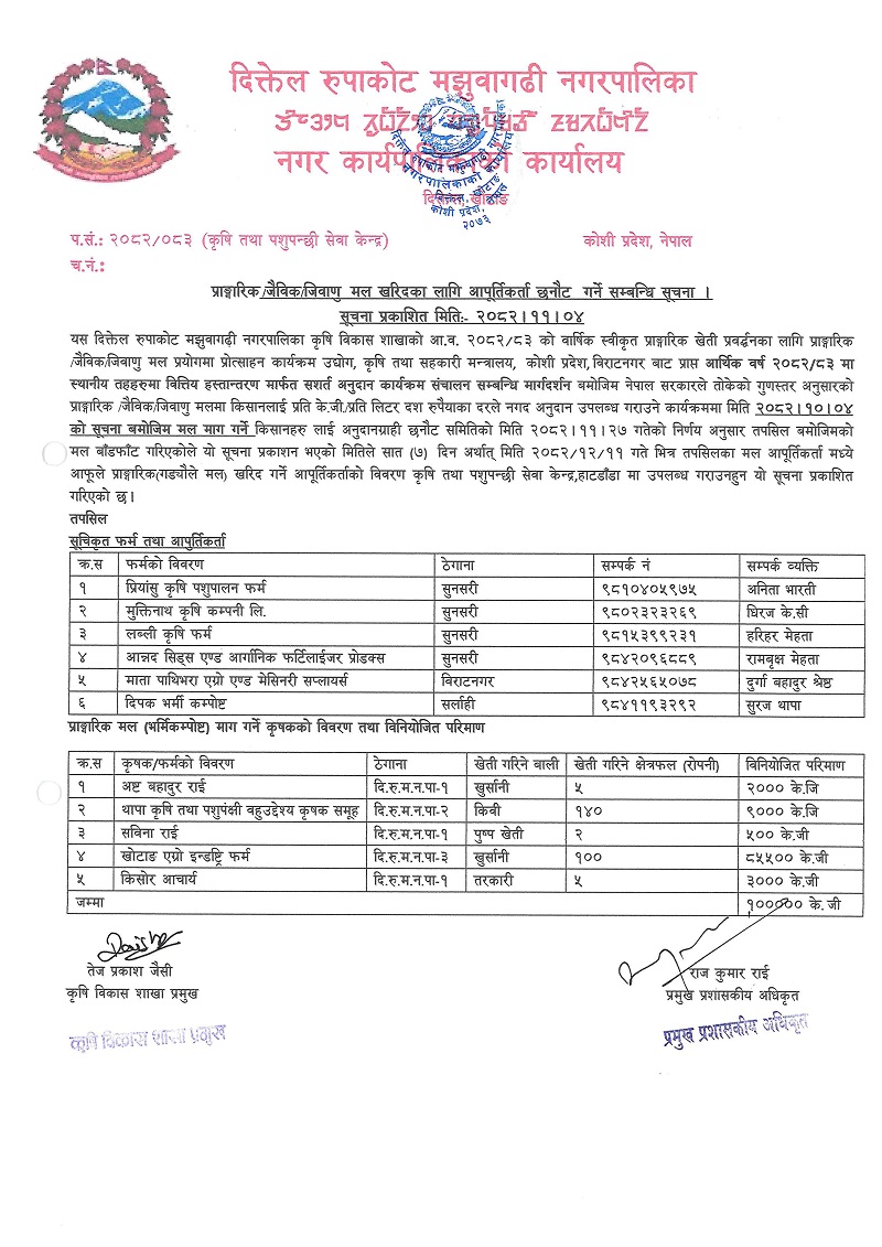 प्राङ्गारिक जैविक/जिवाणु मल खरिदका लागि आपूर्तिकर्ता छनौट गर्ने सम्बन्धि सूचना । (सूचना प्रकाशित मितिः- २०८२।११।०४ गते)