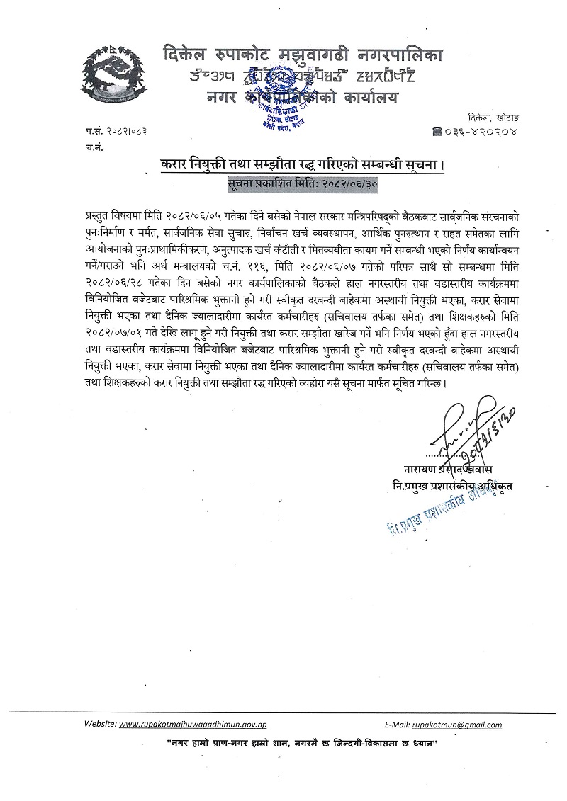 करार नियुक्ती तथा सम्झौता रद्द गरिएको सम्बन्धी सूचना । सूचना प्रकाशित मिति २०८२।०६।३०
