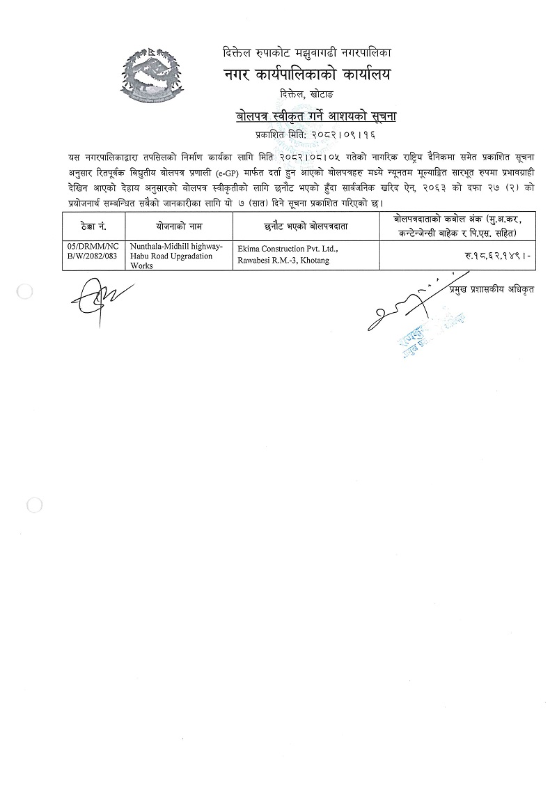 बोलपत्र स्वीकृत गर्ने आशयको सूचना-दिक्तेल-खार्मी-पाथेका सडक स्तरोन्नती।(प्रकाशित मितिः २०८२।०९।०१)