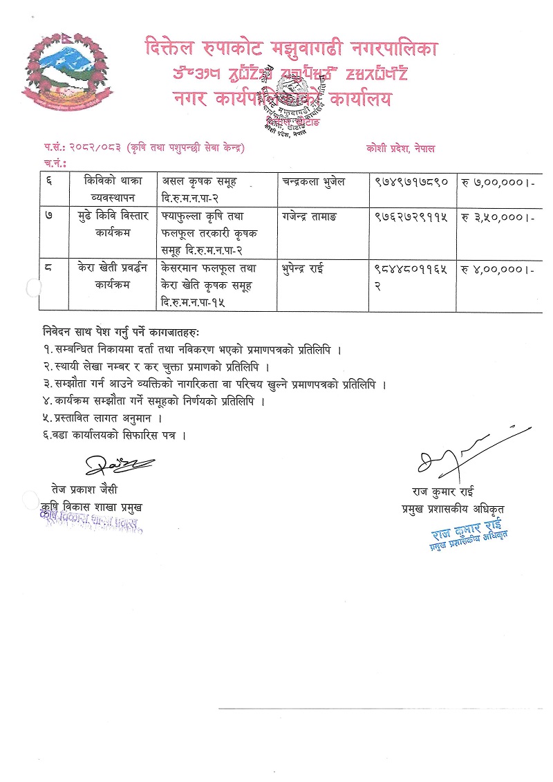 नगर स्तरीय कृषि विकास कार्यक्रमको लागी आवेदन छनौट तथा दावी विरोध सम्बन्धि सुचना । ( सुचना प्रकाशित मितिः २०८२/०९/२३)