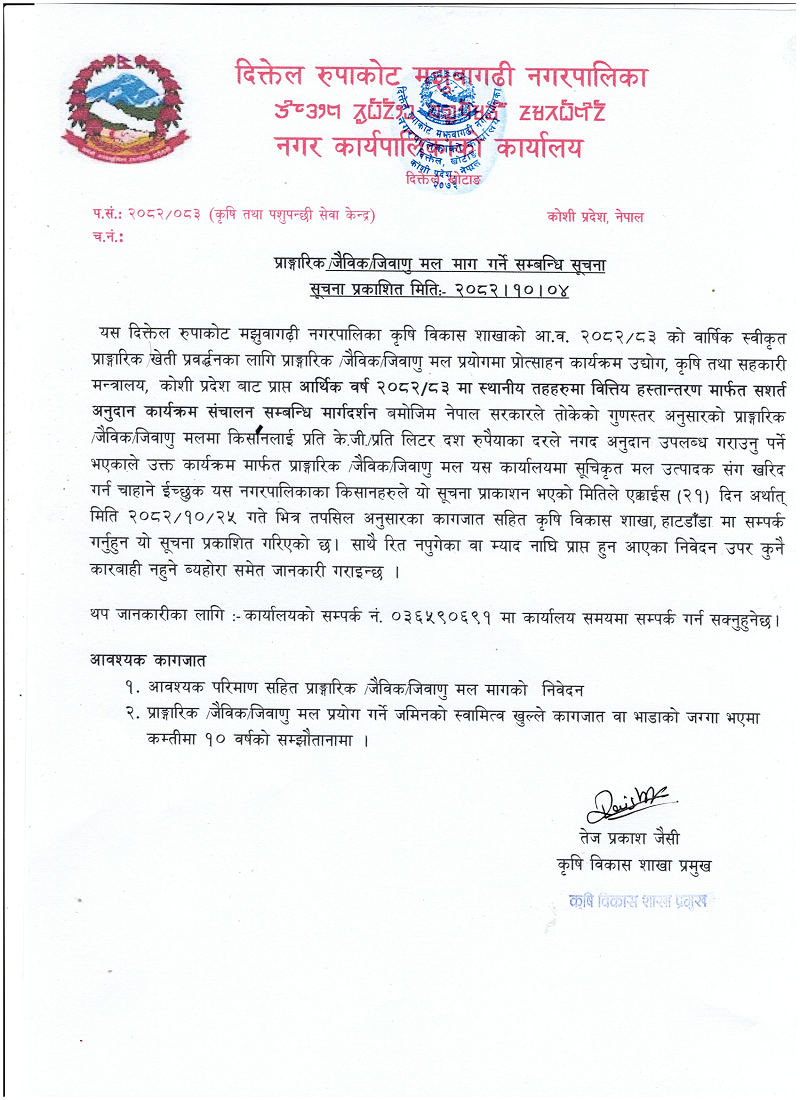 प्राङ्गारिक जैविक/जिवाणु मल माग गर्ने सम्बन्धि सूचना । ( सुचना प्रकाशित मितिः- २०८२।१०।०४)