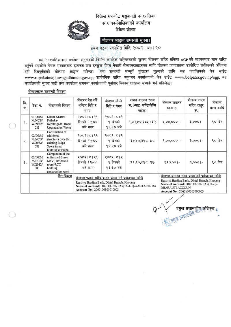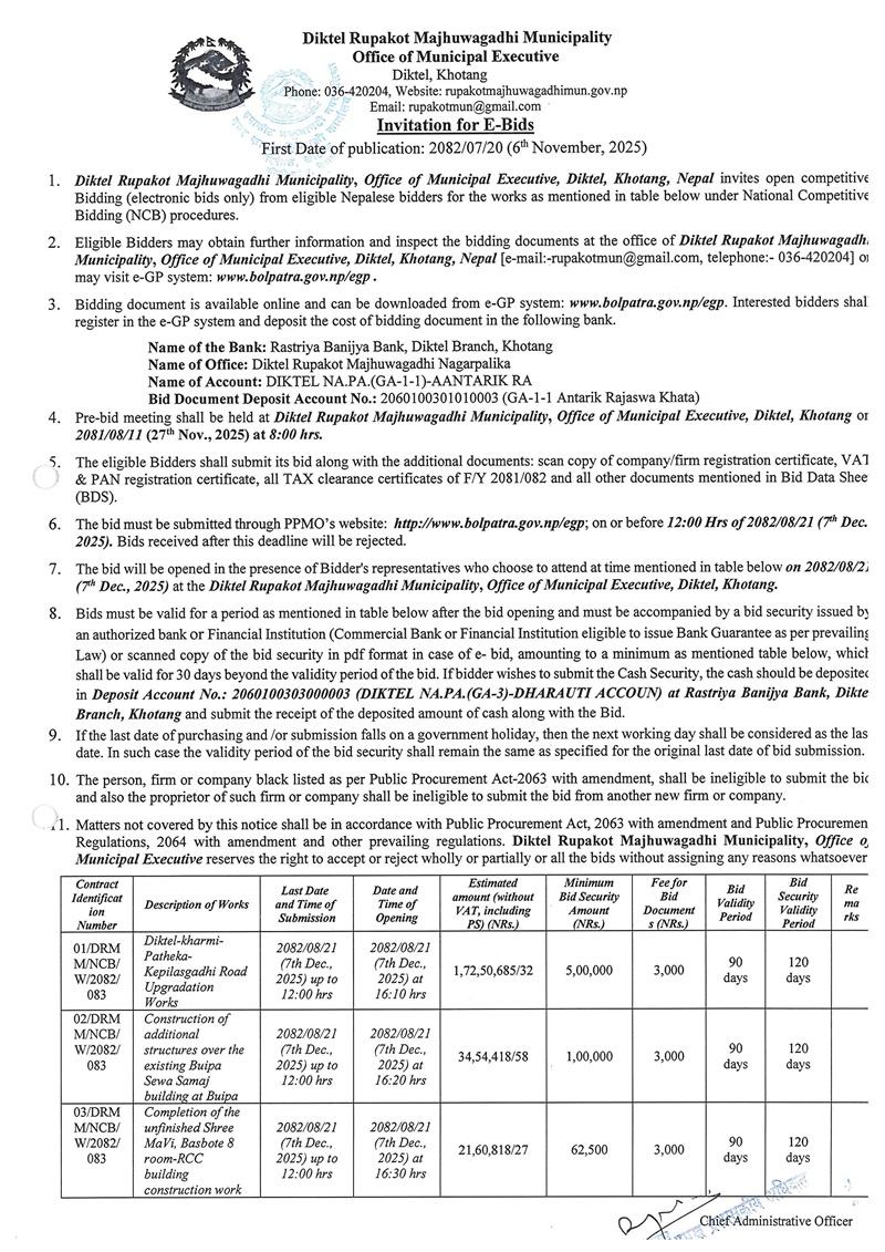 बोलपत्रहरू आह्वान सम्बन्धी सूचना। (प्रथम पटक प्रकाशित मिति: २०८२।०७।२०)