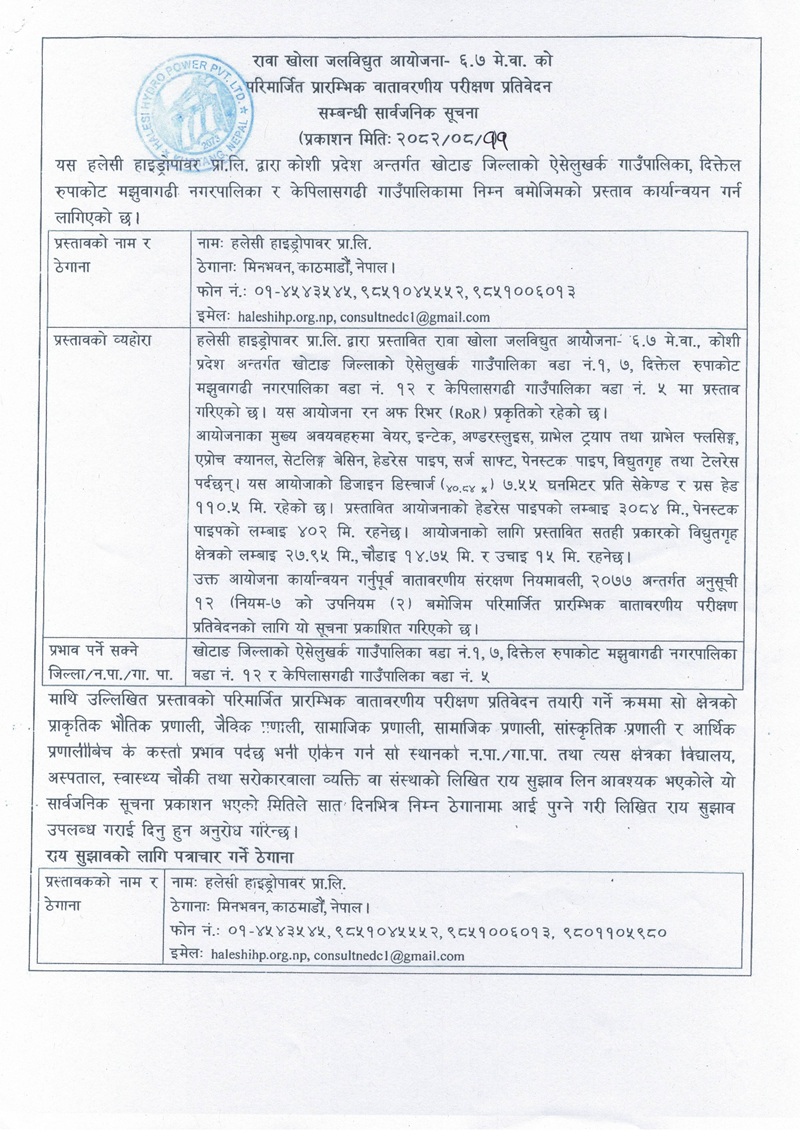 रावा खोला जलविद्युत आयोजना- ६.७ मे.वा.को परिमार्जित प्रारम्भिक वातावरणीय परीक्षण प्रतिवेदन सम्बन्धी सार्वजनिक सूचना। (प्रकाशन मितिः २०८२।०८।११)